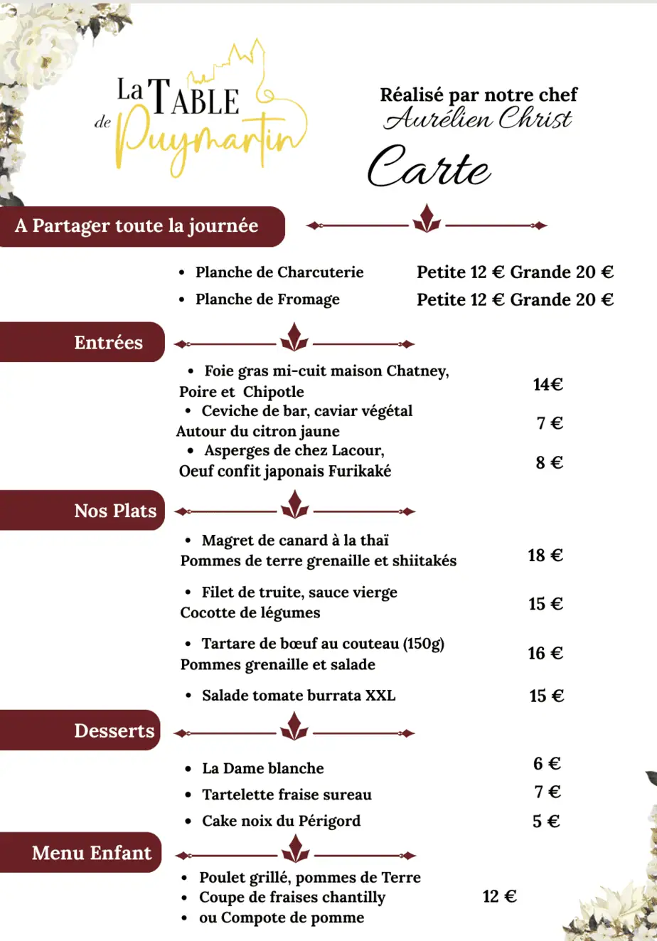 - 15 mai : Dîner à la Table de Puymartin. Menus et tarifs bientôt disponible.